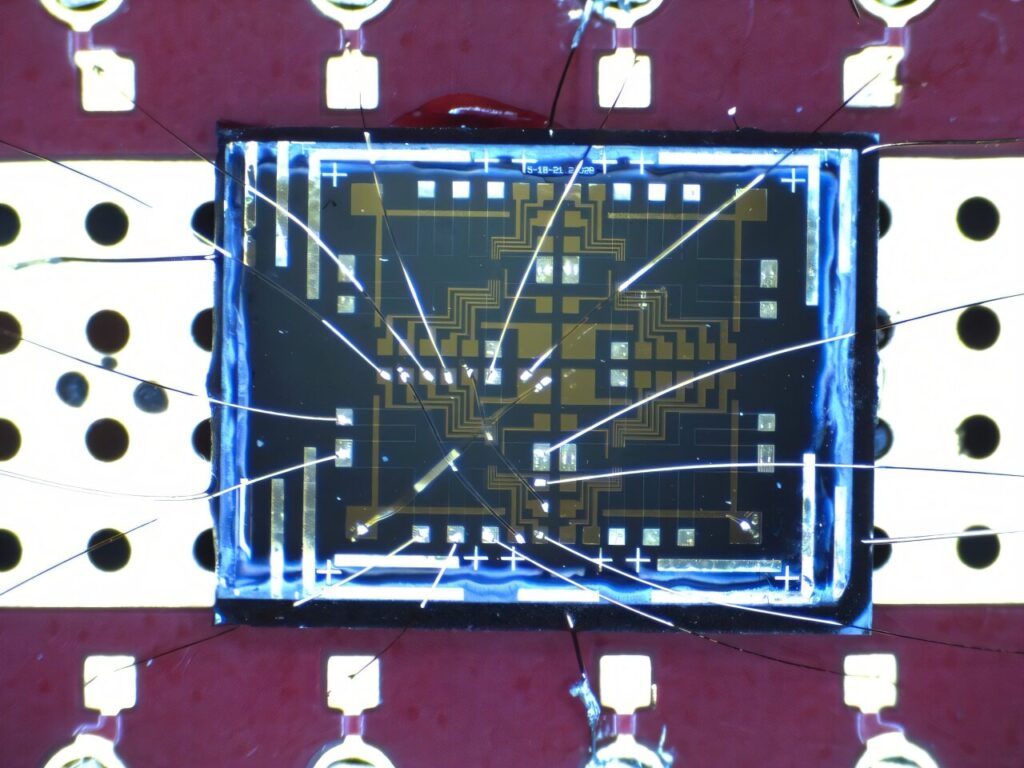 Image showing the actual device measured in the experiment. The GaAs chip is mounted on a PCB board for mounting in the dilution refrigerator. The gold wires make electrical contacts to the device. Credit: Guerrero-Suarez et al.